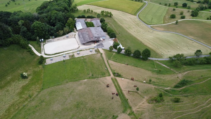 7ha Weiden für 24 Pferde inkl. Weidetränken - saubere Allwetterausläufe mit ausreichend Futterplätzen - 4 Herden à max 6 Pferde - je eine Wallach-, Stuten-, gemischte Herde sowie ein Offenstall für leichtfutterige Pferde.